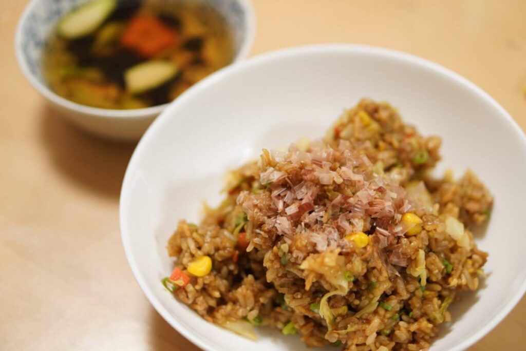 今回のメニューは、「そばめし」+「ラッキーにんじん入りのりスープ」+「フルーツサンド」となっています
