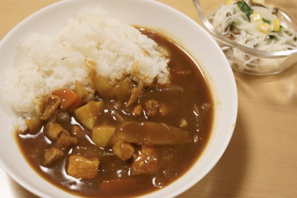今回のメニューは、「チキンカレー」+「ラッキーにんじん入りそうめんサラダ」+「フレンチトースト」となっています