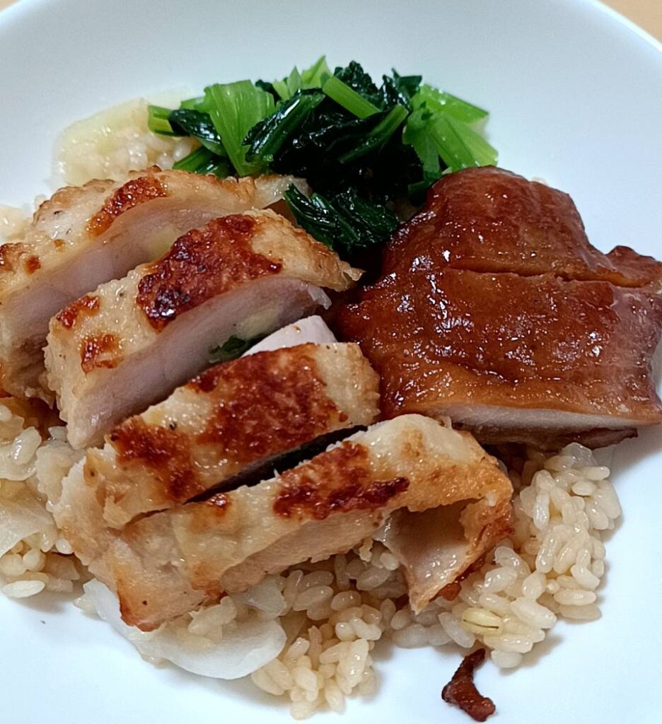 今回のメニューは、「玉ねぎご飯」+「青菜の和え物」+「野菜たっぷりチキンスープ」+「タイ風鶏の照り焼き&アスパラチキンロール」+「わらびもち」となっています