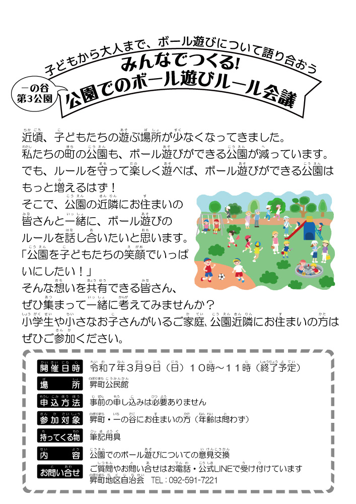 そこで、公園の近隣にお住まいの皆さんと一緒に、「みんなでつくる!公園でのボール遊びルール会議」と題して、一の谷第3公園でのボール遊びのルールを話し合いたいと思います。