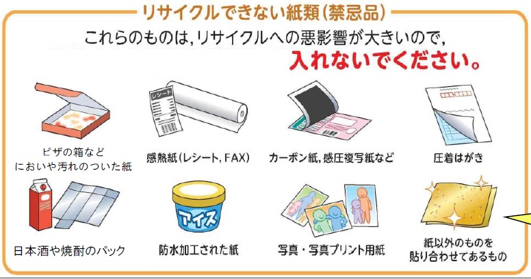 また、雑紙についてもリサイクルできない紙類がありますので、ご確認いただければと思います。 特にピザの箱など、においや汚れのついた紙や、日本酒・焼酎などの紙パックを持ち込まれる方が多いので、ご注意ください。 リサイクルできない紙類は、燃えるゴミとして出していただければと思います。