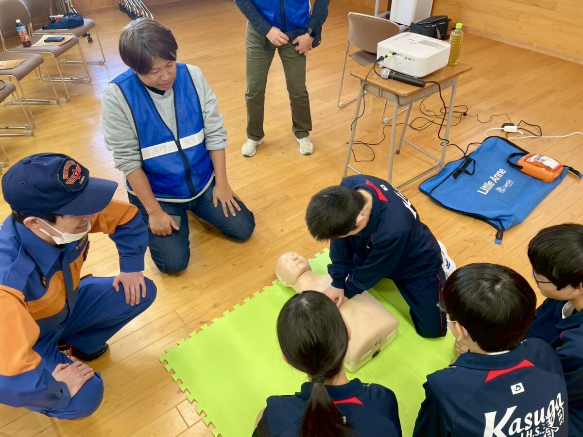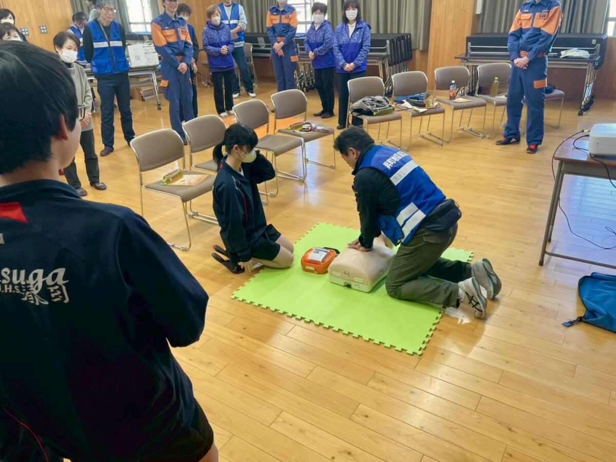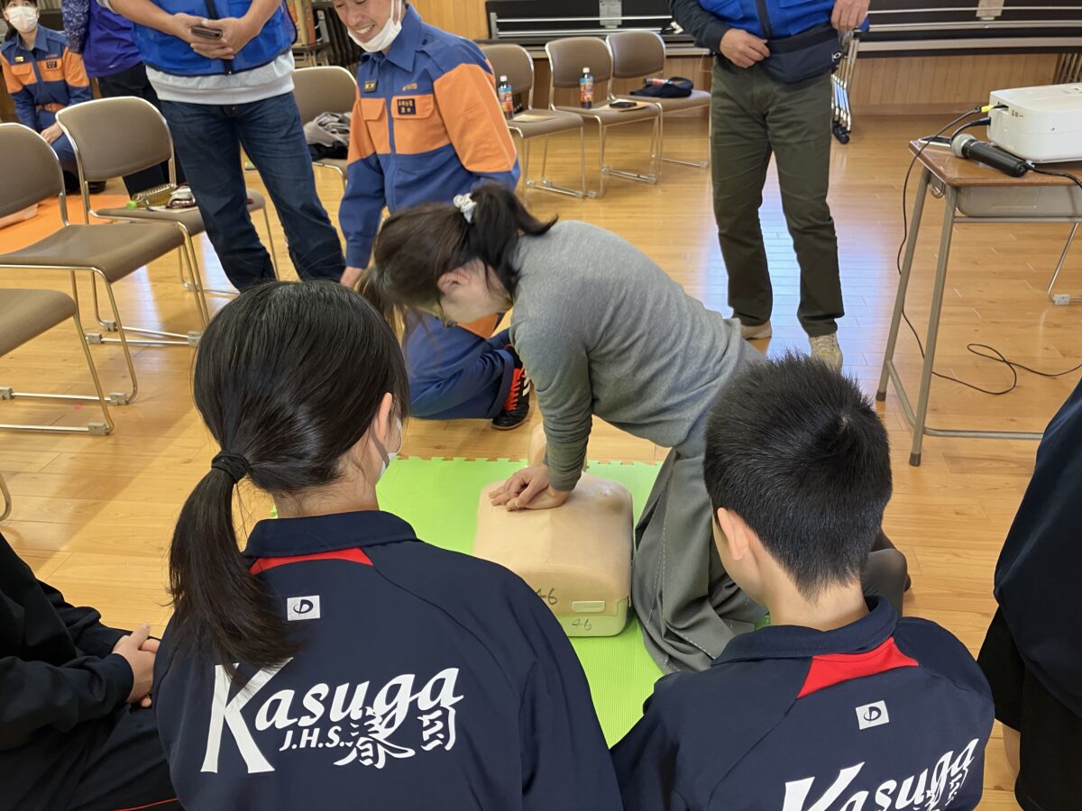 続いて3班に分かれ、胸部圧迫(心臓マッサージ)とAEDの使用方法を実技形式で体験。消防団員の皆さんの丁寧な指導のもと、「どのくらいの強さで押せばよいのか」「体が濡れている時AEDは使えるのか」など質問も活発に出され、実際の場面を想定しながら練習を行いました。