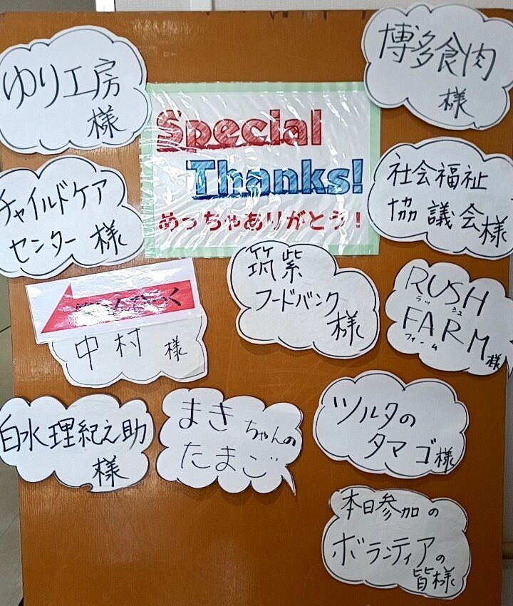 今回のメニューに使用された鶏肉は、春日市一の谷の「博多食肉」様と「福岡県子ども食堂応援プロジェクト」様よりご寄付いただいたものを、副菜のほうれん草は「RUSH FARM(ラッシュファーム)」様、フレンチトースト用の卵は「ツルタのタマゴ」様、そしておやつに提供したラスクは「ゆり工房」様にご提供いただきました。いつも温かいご支援をいただき、誠にありがとうございます。