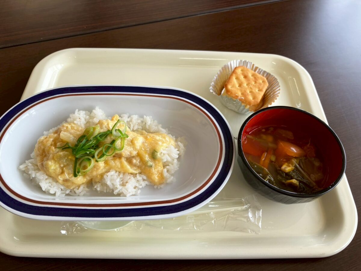 今回のメインメニューは、とろとろ卵の「親子丼」!そこに野菜たっぷりのコンソメスープと、お口直しにぴったりのクラッカーサンドを添えてお届けしました。