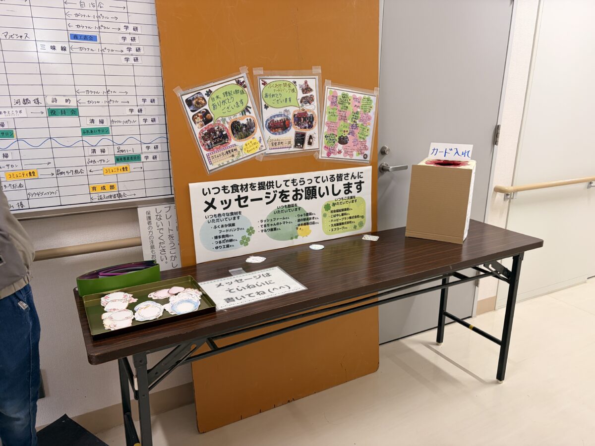 また、ふくおか筑紫フードバンク様、博多食肉様、RUSH FARM様、ゆめ畑(春日店)様、りゅう農園様、マルワ産業様、こばやし眼科様、ハッピープラン様をはじめ、多くの個人・団体の皆様から多大なるご支援を賜りました。この場を借りて、心より感謝申し上げます。